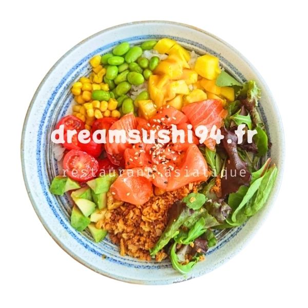 toppings : edamame, avocat, mais, jeunes pousses, tomates cerises, crispy oignons, mangue, sauce maison